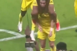 还好没事 队友想骑在C罗肩膀上,却不小心翻下去
