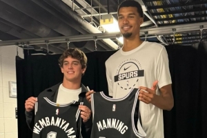 德克萨斯大学橄榄球队成员观战马刺 星三代曼宁与文班合影换球衣