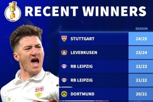 体育资讯10月29日讯 《转会市场》统计了近10年德国杯冠军,拜仁3次居首但已5年未能夺冠,多特、莱比锡各2冠。