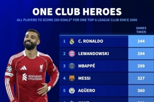 在单一球队进250球所用场次:C罗244场、梅西327场、萨拉赫415场