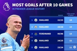 英超前10轮进球榜:前五哈兰德占四席,22-23赛季14球历史最多