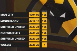 狼队前10轮仅拿2分,英超历史同期积分持平或更少球队最终均降级