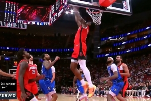 太炸裂了!阿门罚球不进自己冲抢前场篮板 接申京传球空接背扣