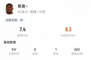 莱奥本场数据:送出助攻+错失1次机会,4次过人2次成功,评分7.4