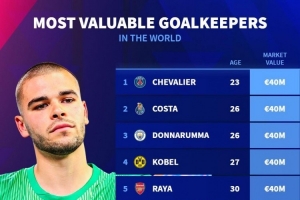 门将德转身价排名:多纳鲁马、科贝尔、拉亚4000万欧并列居首