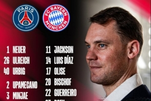 拜仁公布欧冠对巴黎名单:凯恩领衔,迪亚斯、奥利塞在列