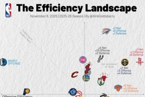 本赛季效率值图表:火箭&雷霆净效率前二 独行侠进攻垫底